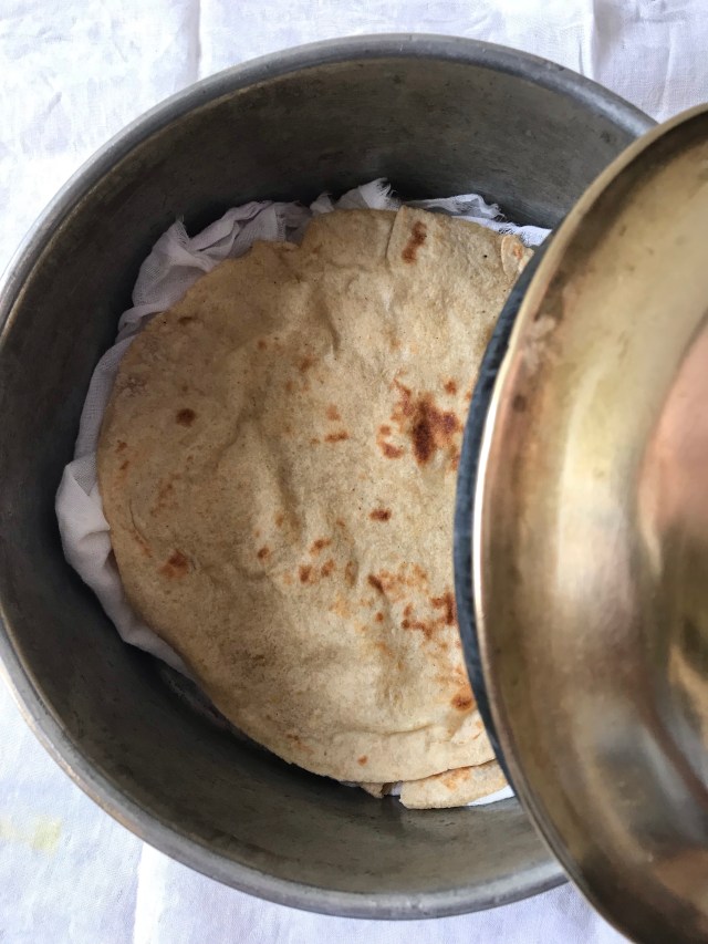 Why it works for me, you may ask. Well, I cannot eat a heavy meal and stay outside the kitchen the entire day. Which is why, I keep reaching out for that roti ka dabba (roti box). My mum used to make a batch of rotis (about six whole-wheat rotis and two bajra/pearl millet rotis) and store it for later. It’s the best thing because when you have those little hunger pangs, you can just grab this box. It’s either some homemade mango pickle rolled in a roti or bajra roti with kadi (recipe in one of my previous posts). Which reminds me, have you tasted thandi (dry) bajra roti with homemade butter (makhan) spread and tiny crystals of sugar lightly sprinkled on it? Boy! I could die for it!