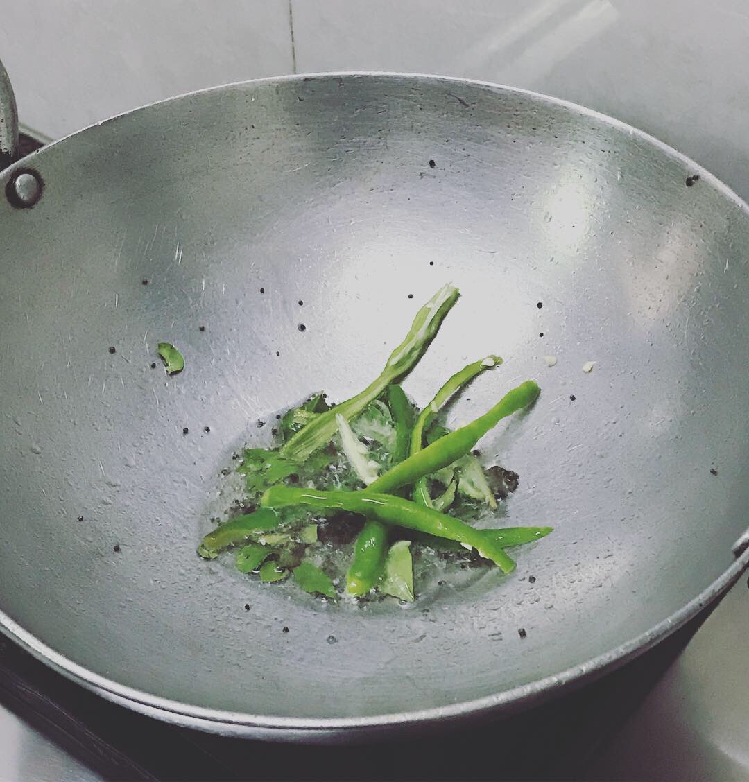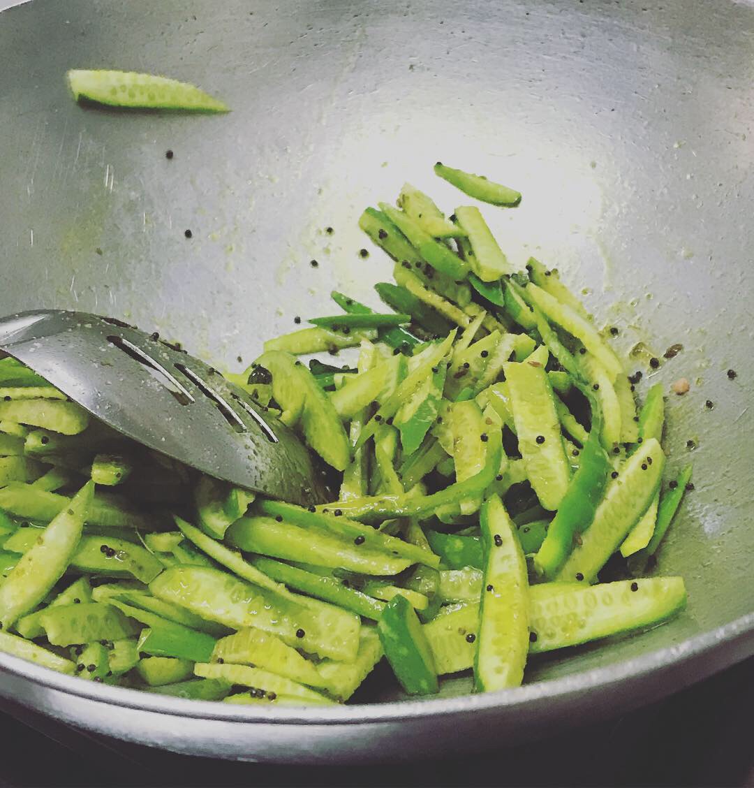 Wash and cut some tindora (I really don’t know what to call this as I haven’t had it in my kitchen before) length-wise. In a skillet, add some oil, a pinch of asafoetida and turmeric powder, slit green chillies, curry leaves abs of course, cumin and mustard seeds. Stir this for five seconds then add the ivy gourd to it. Now add some salt and cook this for 30 to 45 seconds, and remove from flame. Lastly, add some lemon juice and chopped coriander leaves and you’re good to go!