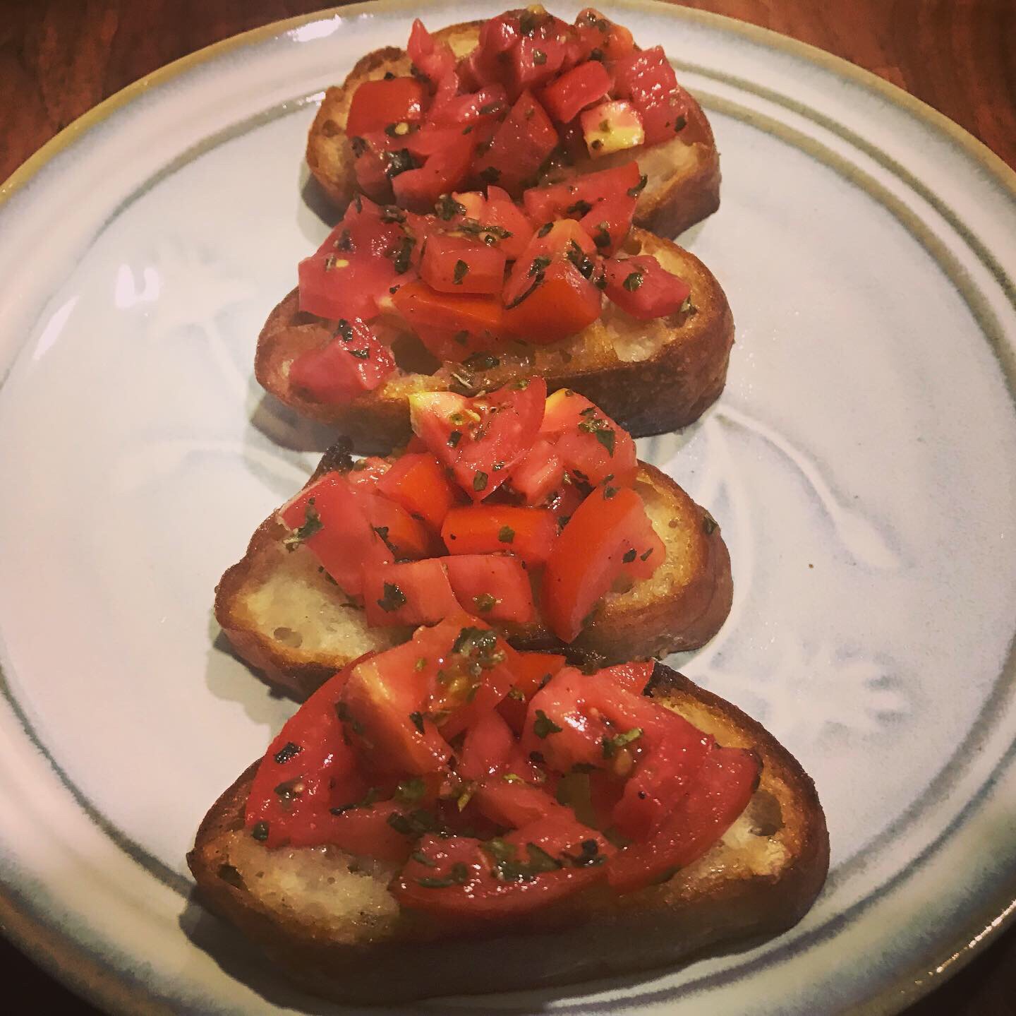 I didn’t have fresh basil leaves in the fridge. Actually I did have some, but they’d gone black. But, nevertheless, I went ahead and made Bruschetta with whatever was in hand. And we loved it as usual; and, it had a nice crunch too.